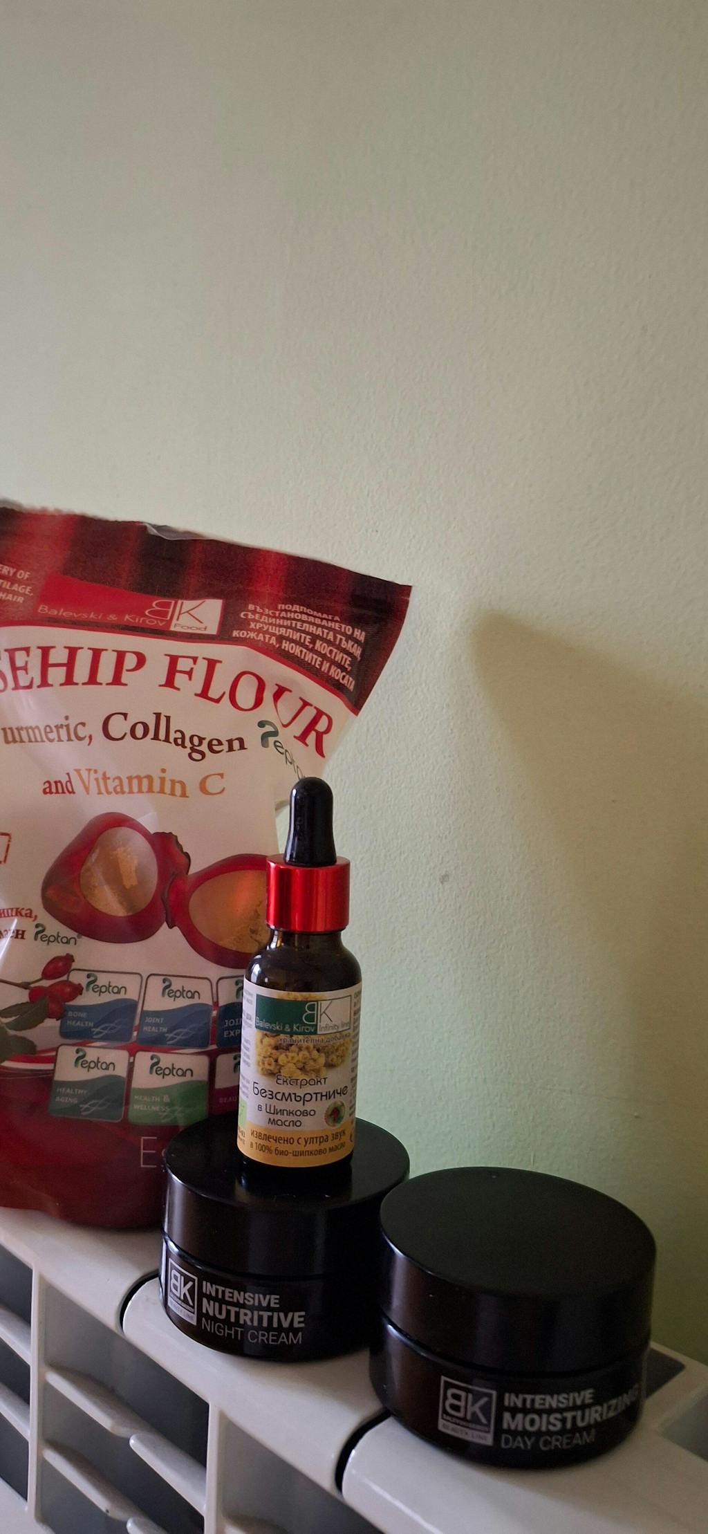 - Студено пресовано шипково масло: Богато на Омега-3, Омега-6, Омега-9 мастни киселини, флавоноиди, бетакаротен, витамини A, C, E, F, K и група B.