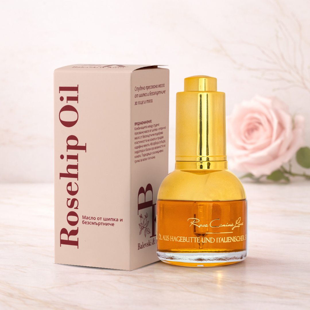 Нашето Масло от Шипка и Безсмъртниче е създадено с една основна цел – да ви помогне да постигнете гладка и млада кожа, като видимо намалите бръчките и фините линии. Комбинацията от шипково масло, богато на витамин C и витамин A (ретинол), и масло от безсмъртниче, известен със своите регенериращи свойства, действа синергично за стимулиране на колагеновия синтез и ускоряване на клетъчната регенерация. Това води до стегната, гладка и еластична кожа, която изглежда значително по-млада и сияйна. С всяка капка, вие активно се борите с признаците на стареене и връщате естествения блясък на кожата си.