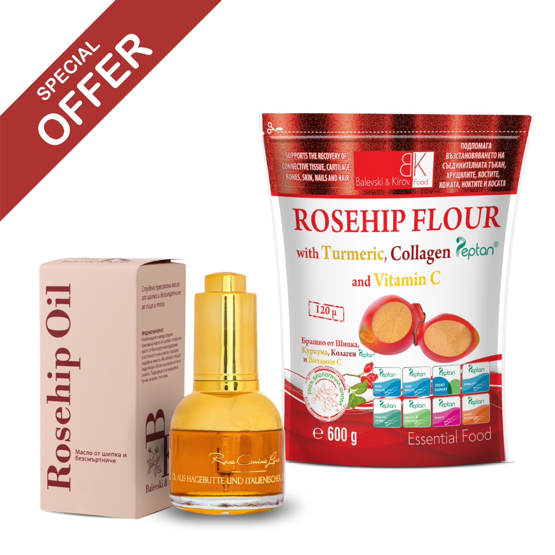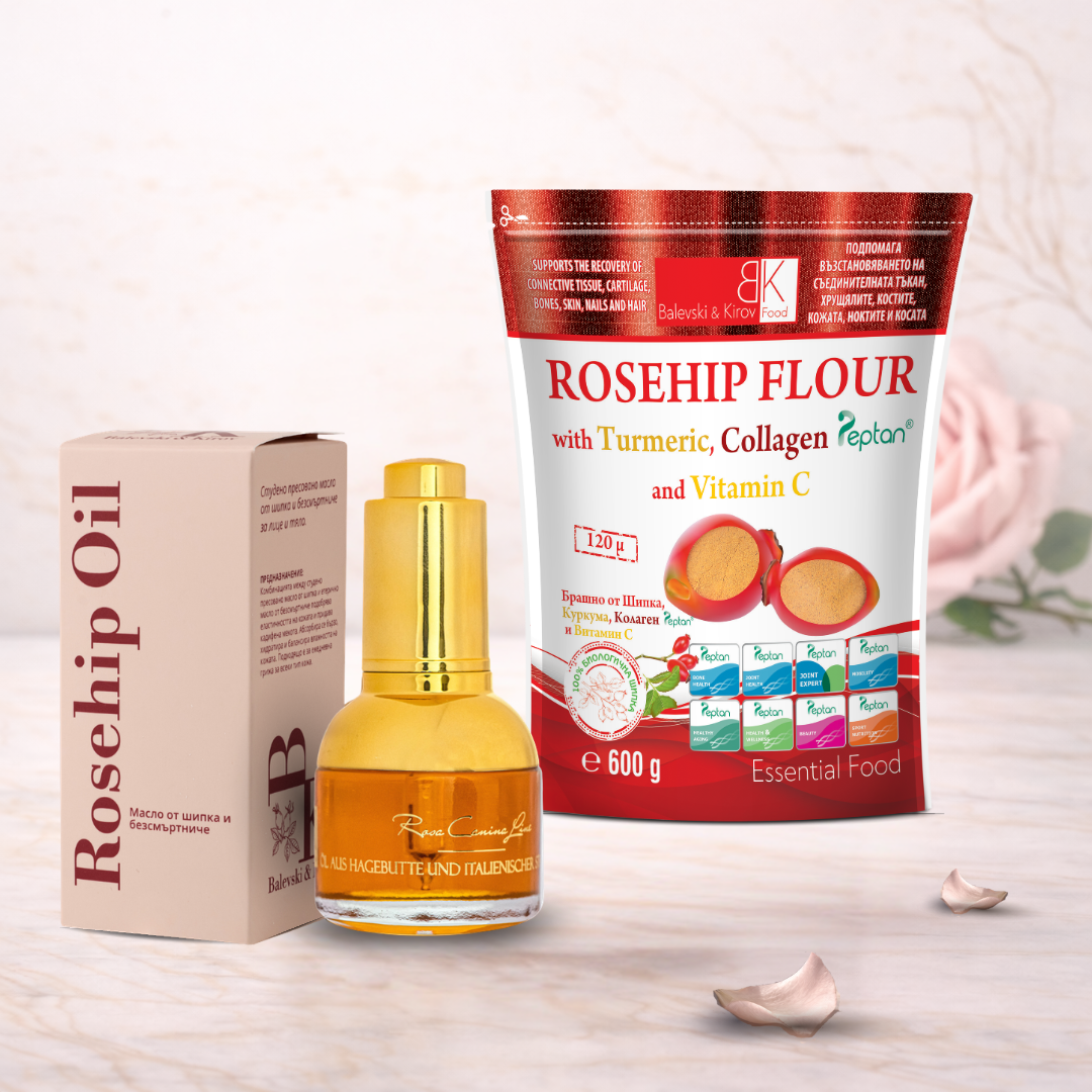 Нашият специален пакет съчетава BK-Collagen Peptan® и Луксозното масло от Шипка с Безсмъртниче, предоставяйки цялостна грижа за вашето здраве и красота. Тези два продукта работят в синхрон, за да поддържат здравето на ставите, хрущялите и кожата, като същевременно подобряват общото ви благосъстояние.