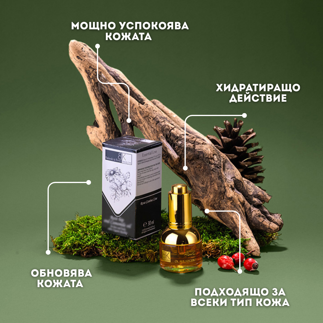 Чистото шипково масло осигурява интензивна хидратация и подхранване, като същевременно изравнява тена и намалява пигментацията. Това масло е идеално за поддържане на здрава и сияйна кожа, подпомагайки нейното естествено възстановяване. Подходящо е за всеки тип кожа и може да се използва като основен продукт за грижа.