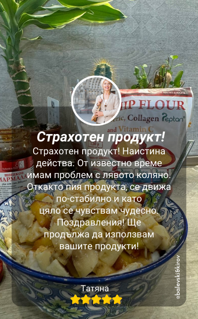BK-Collagen Peptan® с Брашно от Шипка и Колаген Peptan® не е просто иновативен продукт – отзивите от реални клиенти доказват неговата ефективност. С впечатляващ резултат от над 94% удовлетвореност на потребителите, нашият продукт показва своята сила в борбата с болките в ставите, костите и хрущялите. Не вярвайте само на думите ни, а прочетете истинските истории на нашите клиенти, които споделят за значителното подобрение в качеството на живот след употреба на BK-Collagen Peptan®.