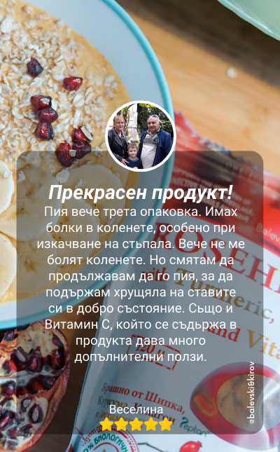 Страхотен продукт! Наистина действа. От известно време имам проблем с лявото коляно. Откакто пия продукта, се движа по-стабилно и като цяло се чувствам чудесно. Поздравления! Ще продължа да използвам вашите продукти!