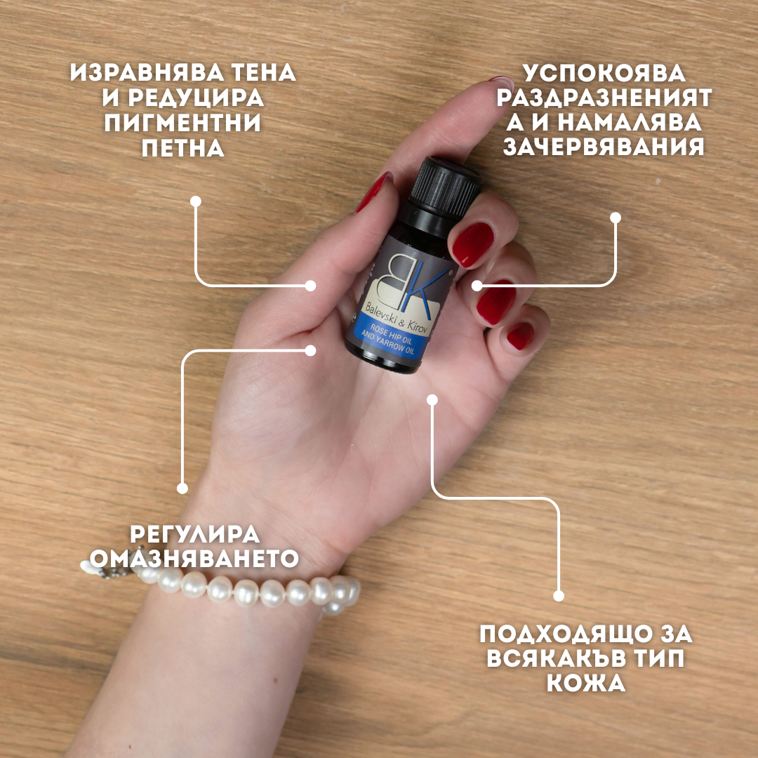 7. Шипково масло с бял равнец: Успокоява кожата и допринася за изглаждането на фините линии и бръчки.